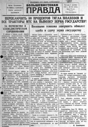 3 декабря 1942 г. районная газета «Большевистская правда» сообщала о социалистических соревнованиях в городах и районах области, обмолоте хлеба и сдаче зерна государству.