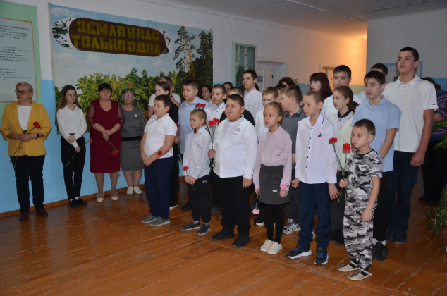 Память Героя почтили минутой молчания. Под звук метронома ребята задумались о том, как сложен путь Защитника Отечества. С грустью и гордостью возложили красные гвоздики к портрету молодого мужчины, который смотрит на них с именной парты.