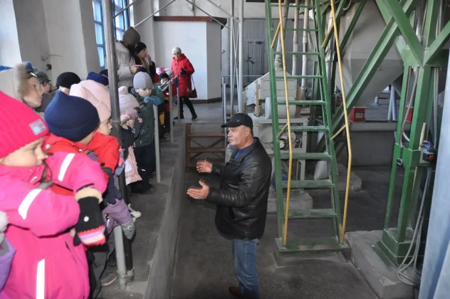 Сначала дошкольники увидели огромные склады, в которых хранится мука разного сорта, а потом перешли непосредственно к самому важному этапу мероприятия — знакомству с технологическим процессом переработки зерна. Владимир Крестьянович рассказал маленьким гостям о современном оборудовании, объяснил принципы работы механизмов и показал разные виды сырья, используемые на предприятии.