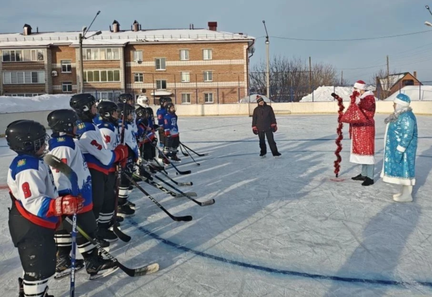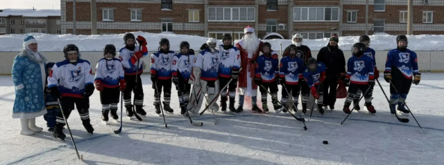 На хоккейной коробке состоялась необычная встреча: Дед Мороз лично поздравил воспитанников спортивной секции по хоккею с наступающим новым годом.