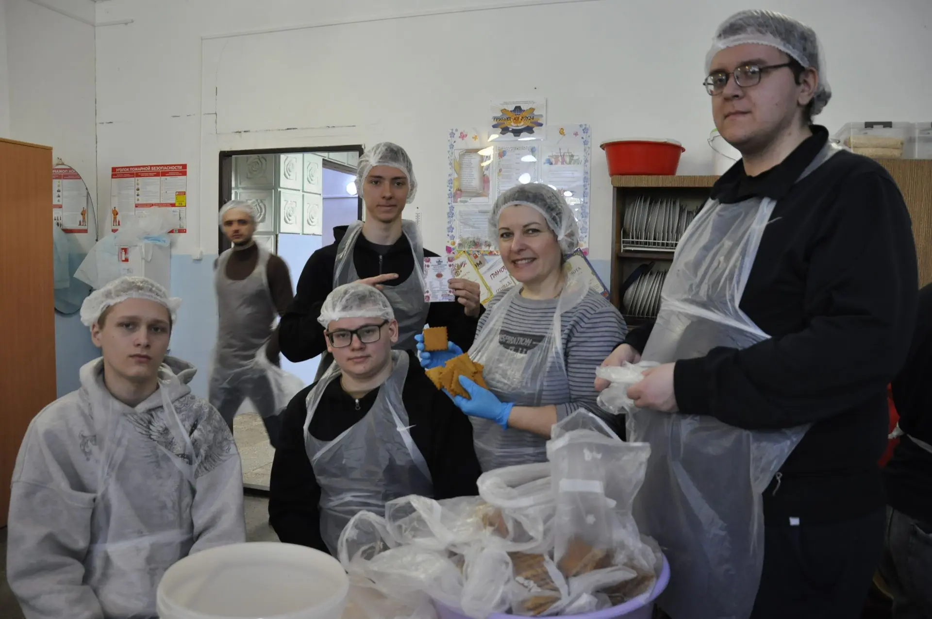 Студенты — будущие кулинары — фасовали имбирное печенье и во время фасовки познакомились с Зинаидой Гартман, волонтёром, которая давно уже печёт сладости на фронт, но впервые приняла участие в фасовке супов. Самым смелым оказался Вова Стафиевский. Он обратился к Зинаиде Григорьевне с просьбой о том, что им, будущим кулинарам, интересно было бы узнать, как печь такое же печенье. А следом и остальные ребята поддержали Вову.