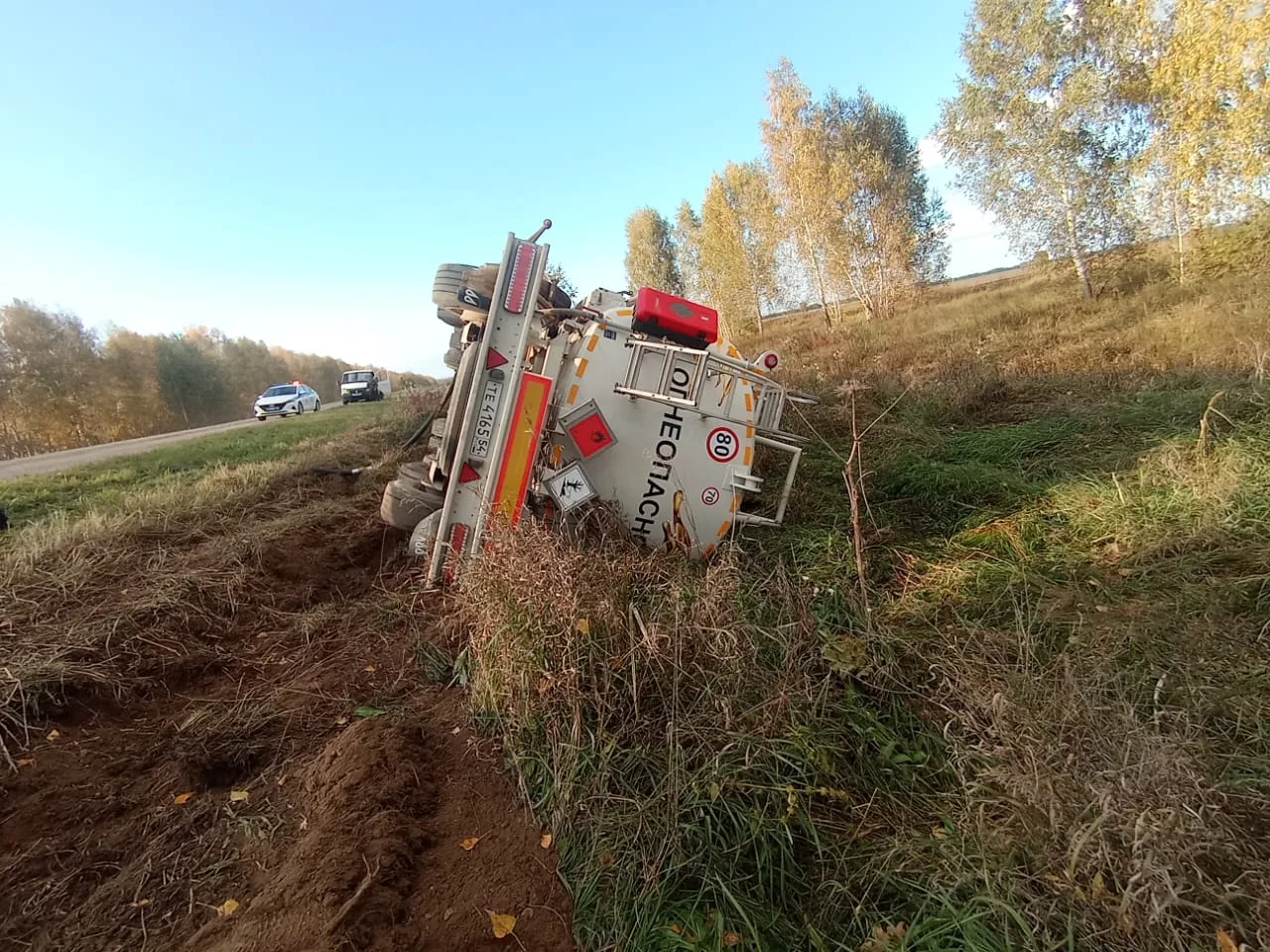 Бензовоз совершил съезд в правый по ходу движения кювет с последующим опрокидыванием
