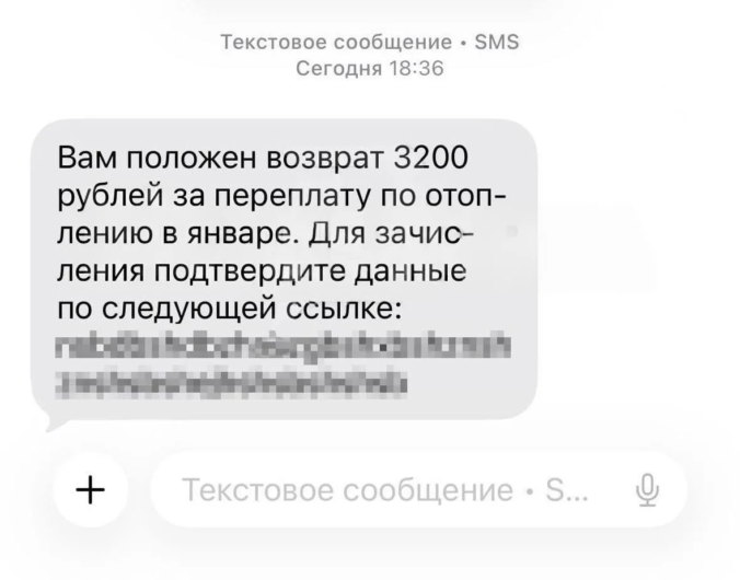 «Вам положен возврат 3200 рублей за переплату по отоплению в январе. Для зачисления подтвердите данные по следующей ссылке: …»