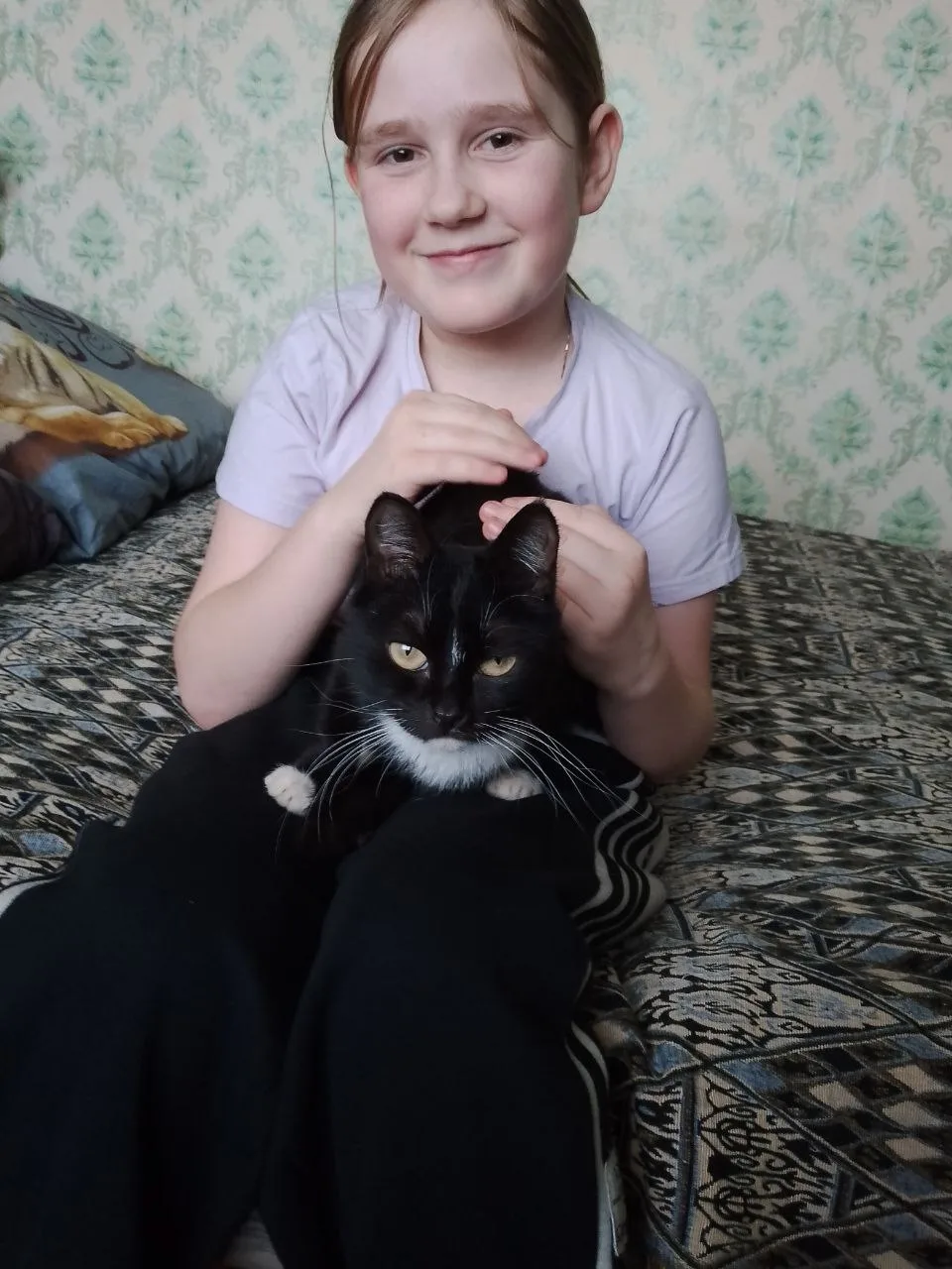 Она у нас появилась, когда мне было девять лет, а сейчас мне 11. Муся у меня добрая, ласковая, нежная. Я кормлю её, забочусь о ней, люблю её очень. Она у меня особенная, двушёрстная, чёрно-белая. А глаза у неё, как травушка: зелёные. Муся любит сидеть у меня на коленях и смотреть со мной мультики. Нам очень нравится «Зверополис». Мы часто с кошкой проводим время вместе, играем, балуемся, ей нравится, когда её гладят. Она очень красиво при этом мурчит, она моя любимка!