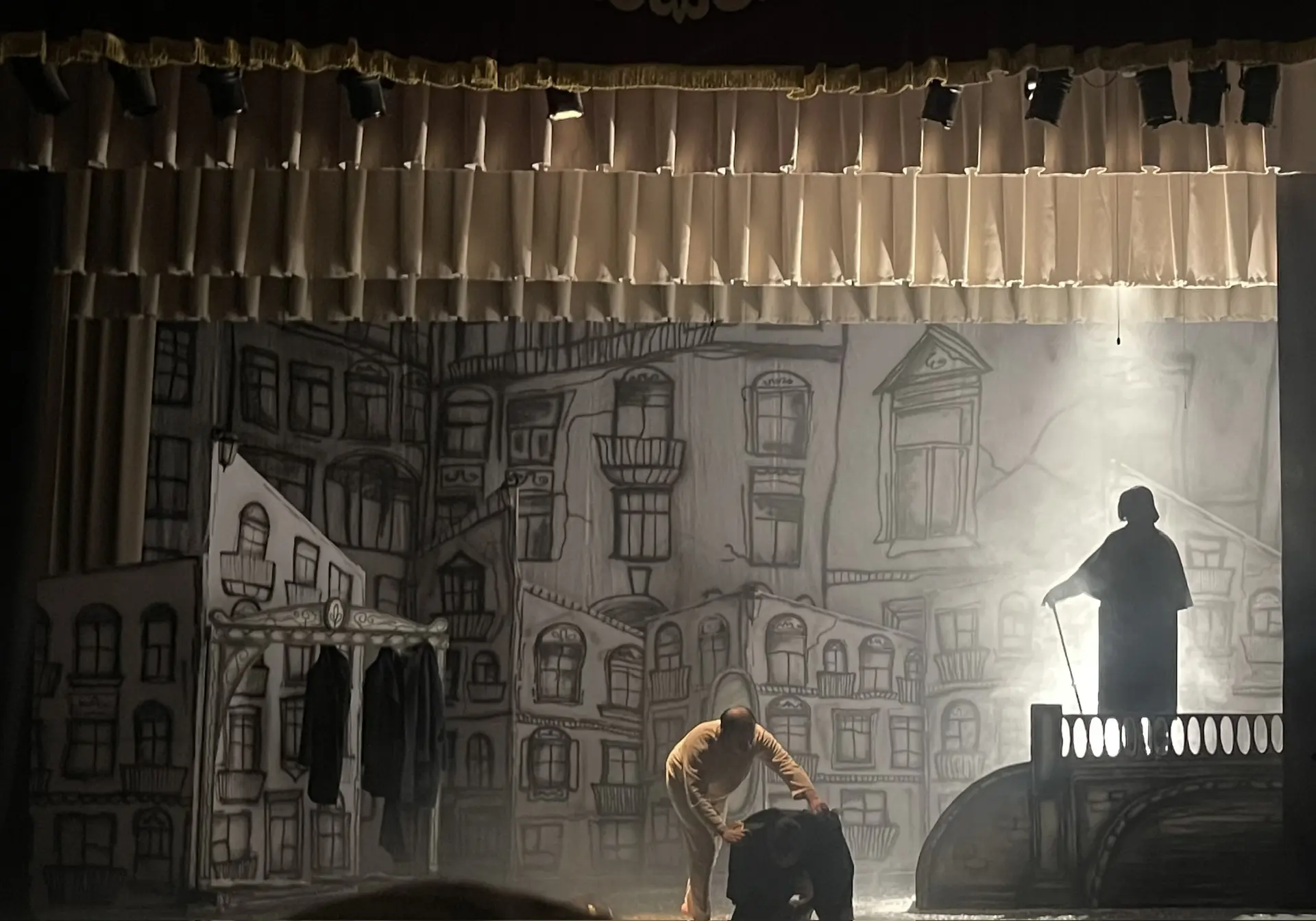 Цветовая гамма костюмов была выдержана в тёмных тонах, все были одеты в шинели. Декорации были минималистичными. Мне очень понравилось музыкальное оформление, хореография, необычное сценическое освещение. Начало спектакля было спокойным и непринуждённым, а финал — эмоциональным и очень драматичным, что оставило особое впечатление.