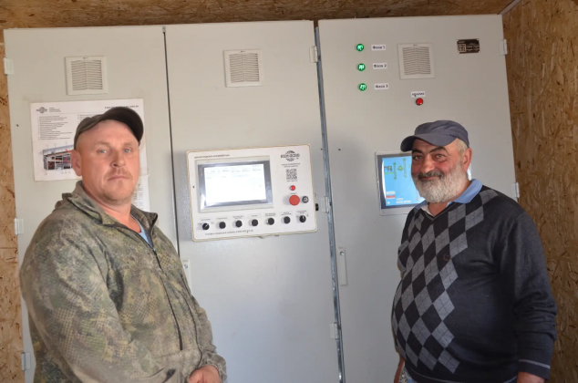 За процессом сушки и показателями датчиков зерносушильного комплекса из специальной кабины наблюдают машинисты Сергей Ковынев и Эмиль Хачинян. «Когда сработают датчики и поступит сигнал – значит бункер наполнился, зерно готово», — говорят они.