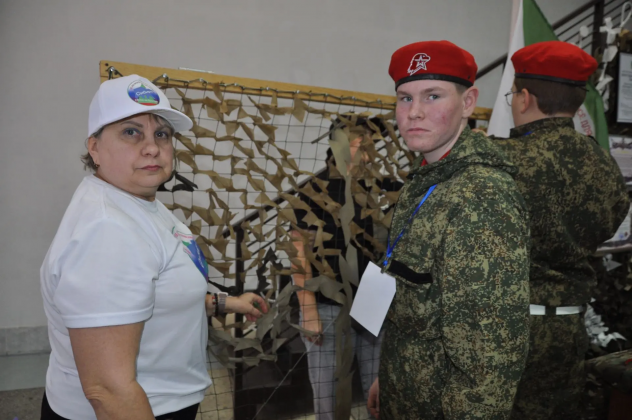Волонтёрская организация «Сибирь своих не бросает» организовала мастер-класс по плетению маскировочных сетей. Те, кто никогда этого не делал, могли в течение некоторого времени научиться. Координатор группы Вера Филоненко с радостью показывала ребятам эти несложные приёмы.