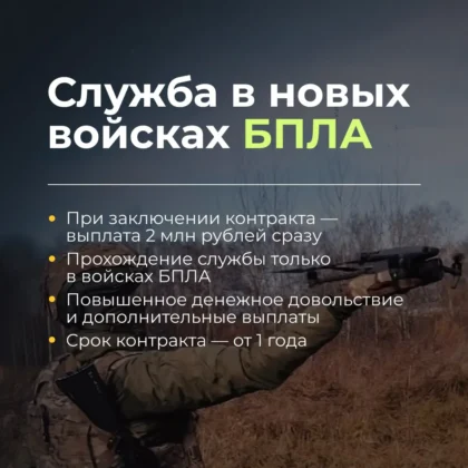 Для мужчин от 18 до 46 лет годных по состоянию здоровья — служба в новых войсках БПЛА. Сразу при заключении контракта выплата также составит 2 млн рублей.