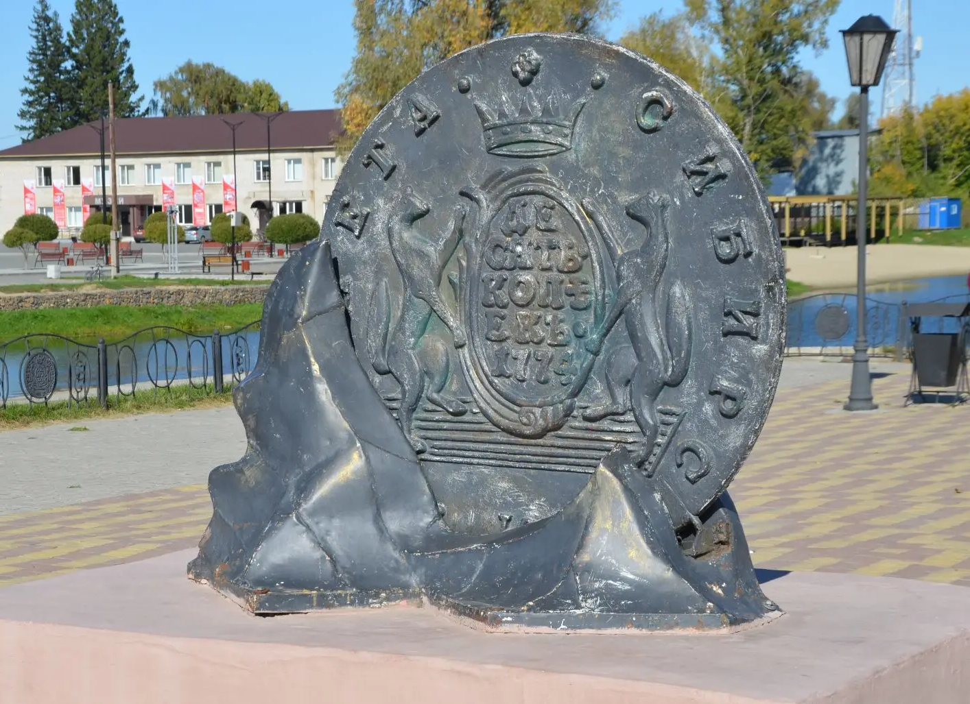 Идея создании памятника Сибирской монете привлекла не профессиональных дизайнеров и скульпторов, а творческих представителей района. Был объявлен конкурс на создание эскиза памятника. Из 19 представленных эскизов победителем стал эскиз 12-летнего воспитанника Сузунской детской школы искусств Юры Волкова. Помогал ему одноклассник Андрей Байкалов, оба учащиеся Сузунской школы №1. Памятник стал местной достопримечательностью, визитной карточкой посёлка. Из монолита горной породы как бы вырастает монета номиналом в десять копеек. Памятник установлен рядом с гидросооружением, где стоял монетный двор, на котором чеканились монеты подобного номинала. Была благоустроена площадь, получившая название Монетной. Появились скамейки, фонари, клумбы. Здесь встречается молодёжь, проводятся свадебные фотосессии. Сюда приезжают экскурсии со всей Новосибирской области.