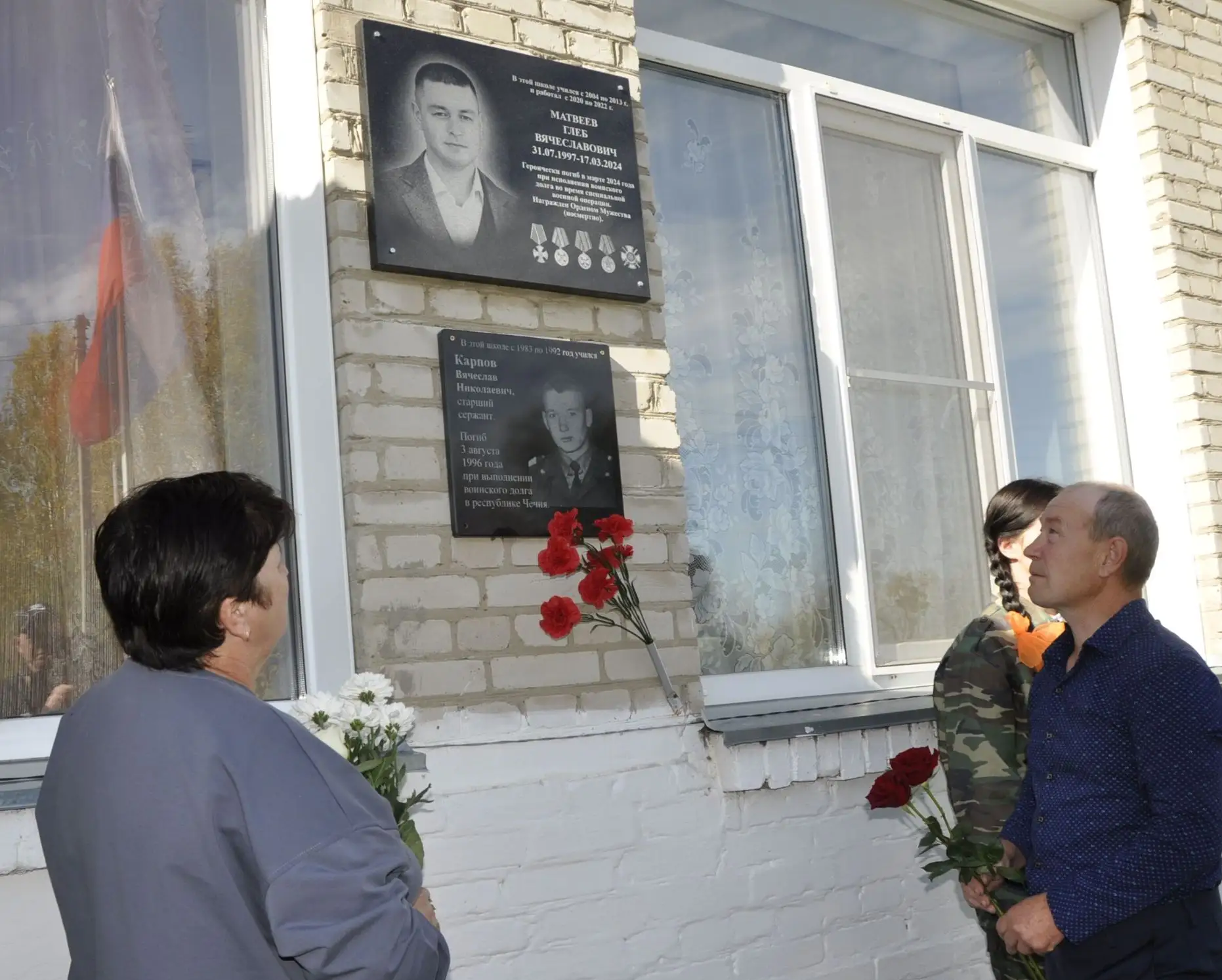 Минутой молчания почтили память всех героев, защитников Отчества. Мемориальную доску памяти Глеба Вячеславовича Матвеева открыли его родители Вячеслав Николаевич и Евгения Ивановна. Вдова Дарья Дмитриевна, дедушка Николай Васильевич, сестра Лилия Вячеславовна и все присутствующие возложили цветы.