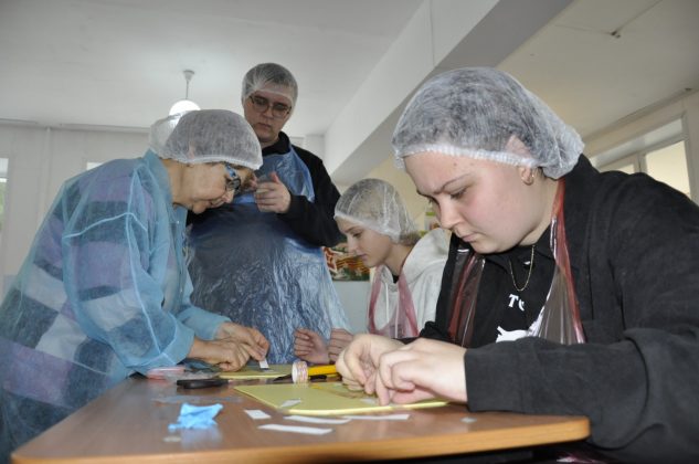 Волонтёр Надежда Салтыкова показывает, как приготовить сушеный картофель, мясо и фасоль. Под контролем Надежды Петровны студенты второго курса измельчали, раскладывали и сушили основные ингредиенты, учились пользоваться оборудованием- электрошинковкой, электросушилкой. Парни и девушки задавали вопросы о времени сушки и режимах термической обработки для различных ингредиентов, как быстро и качественно подготовить большой объем продуктов.