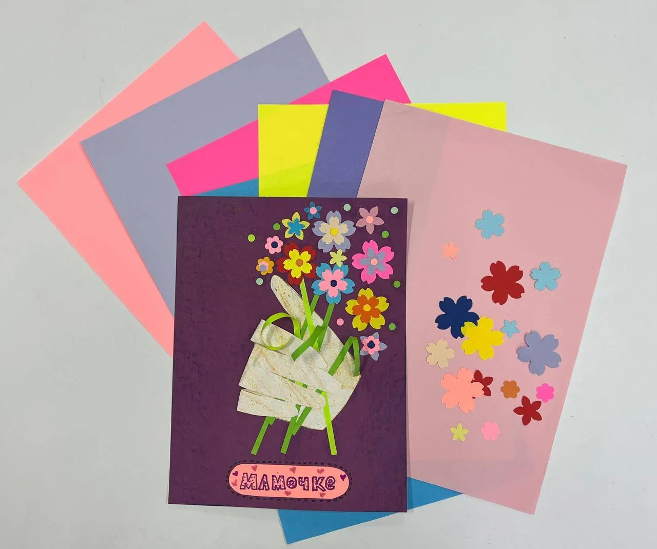 Перед обучающимся стояла задача составить многослойный цветок из цветочков-заготовок, сделанных фигурным дыроколом, и красиво наклеить на открытку, добавив зелёные веточки из полосок бумаги. Последний штрих — поздравительный текст, содержание которого каждый выбрал сам. В конце мастер-класса — фото на память и пожелания творческих успехов.