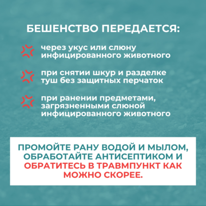 Не гладьте, не кормите и не приближайтесь к бродячим или диким животным — даже если они кажутся дружелюбными. Один укус или царапина может быть фатальной. Если контакт случился, немедленно промойте рану водой с мылом и обратитесь к врачу!Вакцина от бешенства эффективна на 100%, если начать курс сразу после укуса. Полный курс антирабической вакцинации включает 6 инъекций: первую прививку делают в день обращения, а далее – на 3, 7, 14, 30, 90 сутки после укуса.