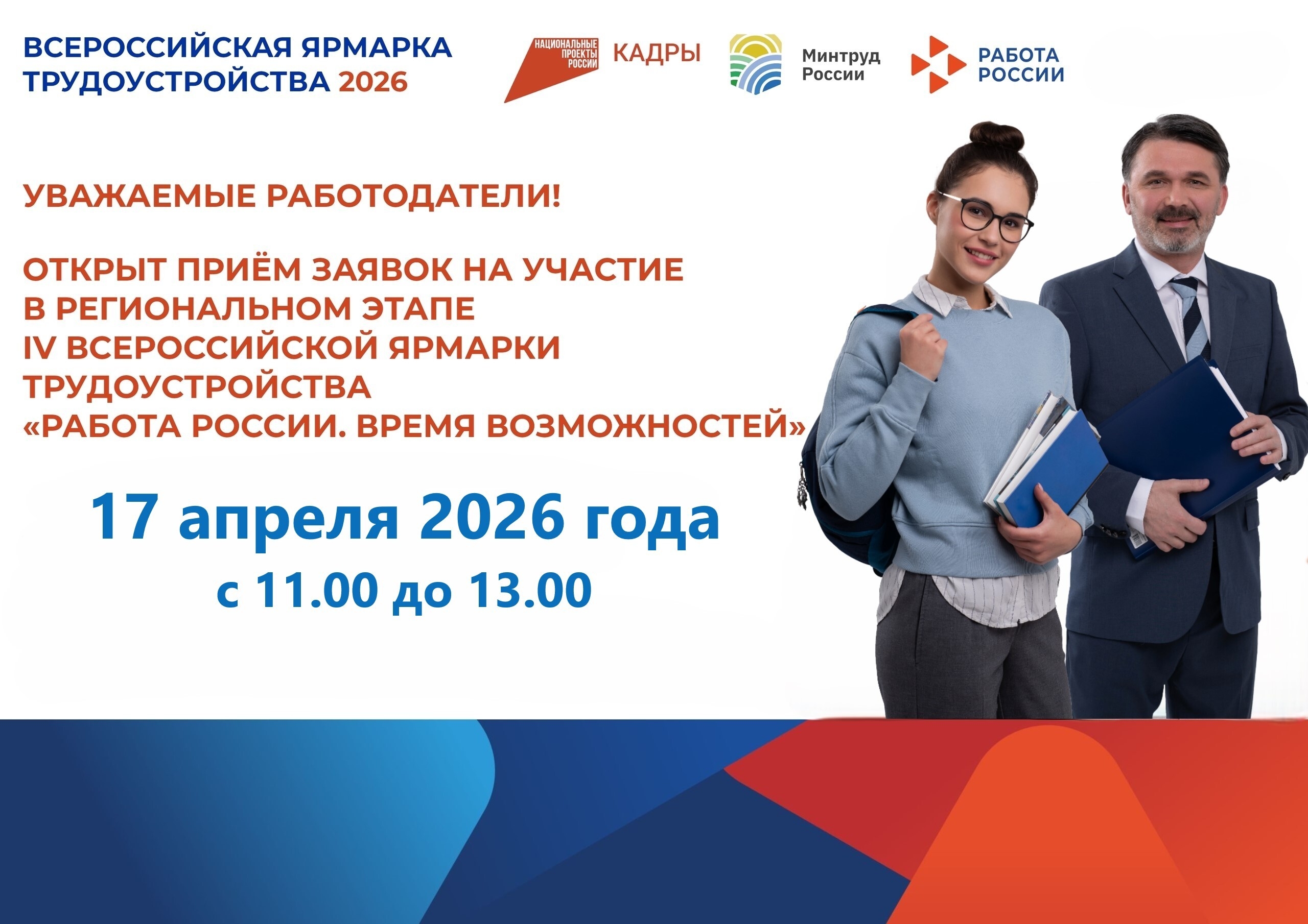 Открыт приём заявок на участие в региональном этапе Всероссийской ярмарки трудоустройства «Работа России. Время возможностей», которая состоится 17 апреля 2026 года!